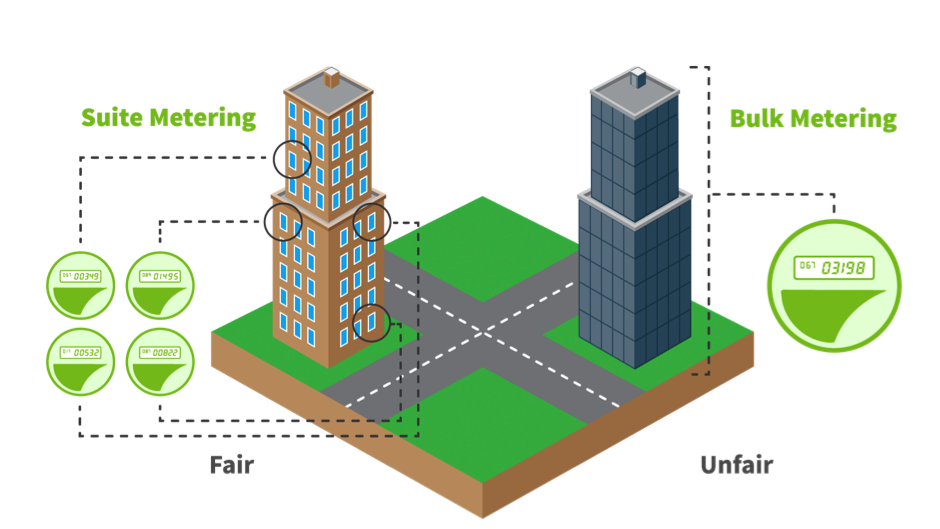Whether already outfitted, included in new construction or added in a later conversion, once a building is equipped to suite meter we assist landlords, property managers and condomium companies obtain precise readings, invoice accurate amounts, and collect payments. Suite Metering is the only fair way to allocate utility costs amongst Residents of multi-suite properties. Traditional Bulk Metering takes the aggregate of the building’s utility usage and costs, and then splits it up equally to all suites based on square footage. This is an unfair way of splitting utility costs.